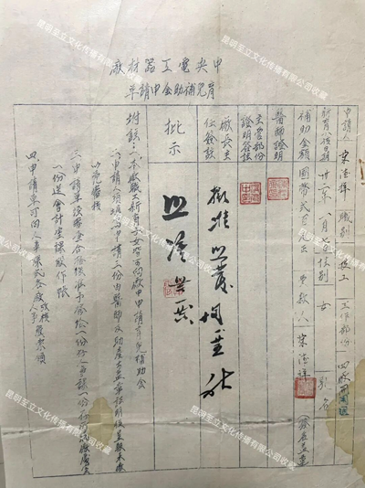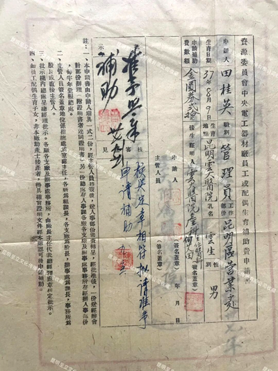▲1948年8月中央电工器材厂(昆明电缆集团前身)发放职工育儿补助金圆券20元。